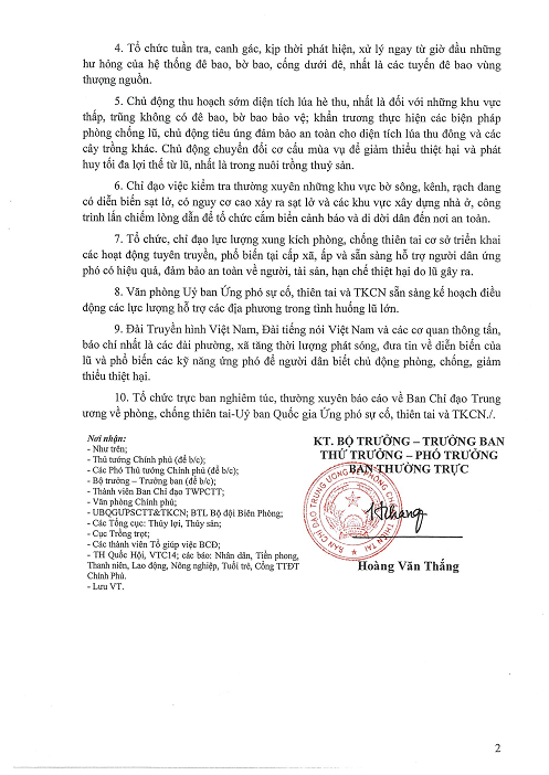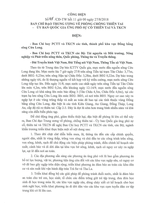 Công điện 45 ngày 27/82018 của Ban Chỉ đạo TW về PCTT - UBQG Ứng phó sự cố thiên tai và TKCN